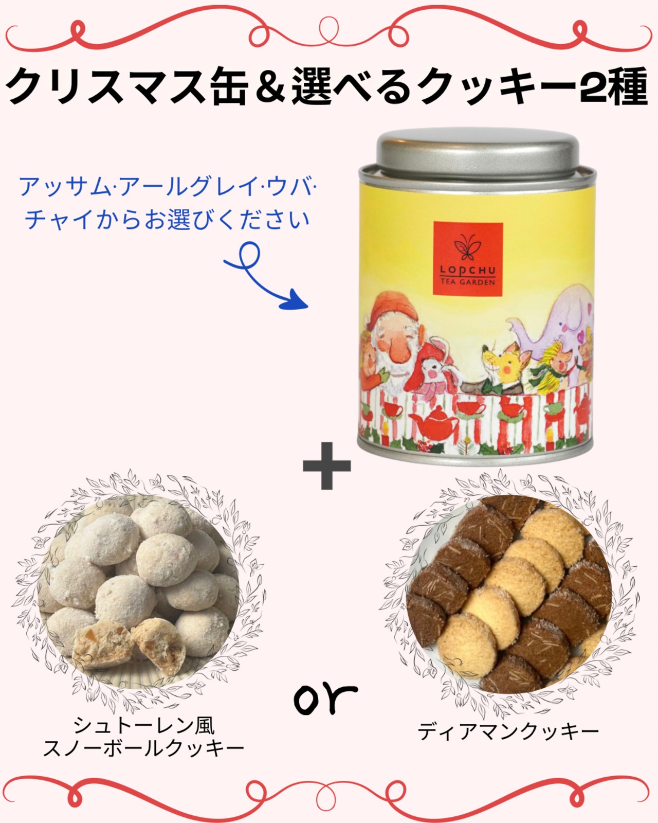 クリスマス缶と米粉のディアマンクッキーorシュトーレン風スノーボールクッキーのギフトです。
