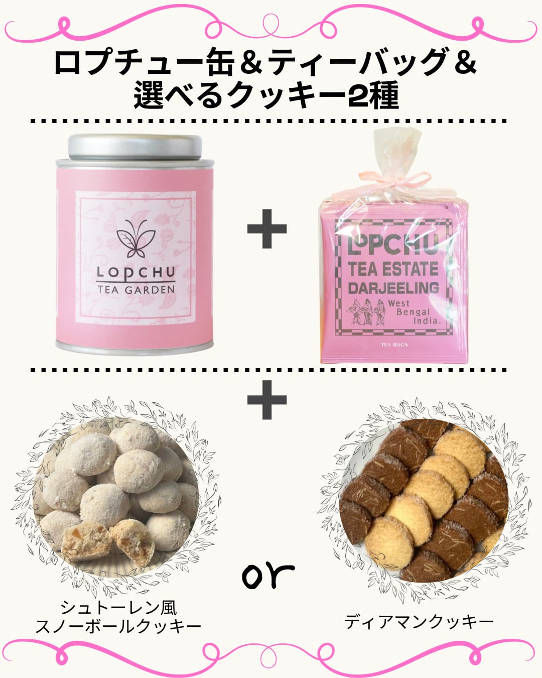 ロプチュー缶とロプチューティーバッグ10個と米粉のディアマンクッキーorシュトーレン風スノーボールクッキーのギフトです。